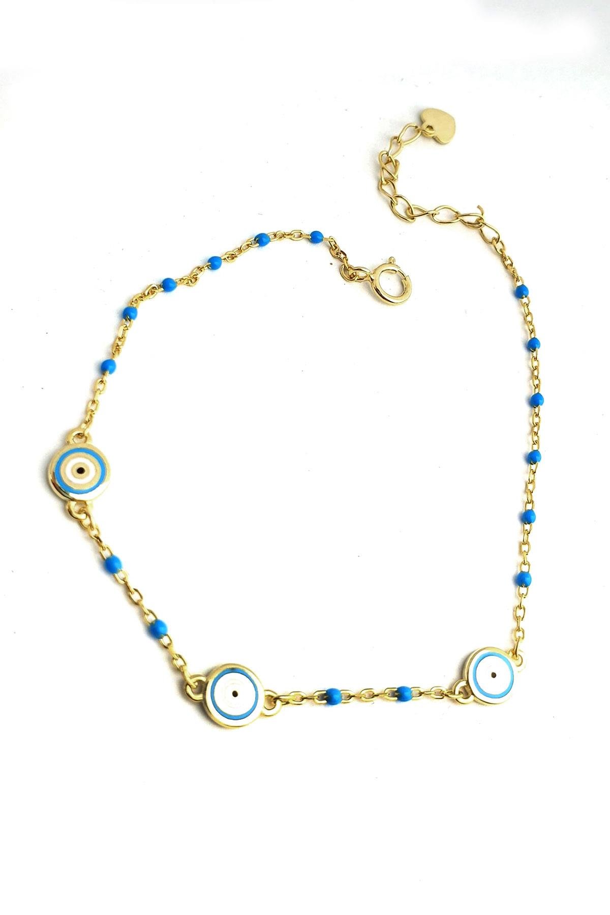 Cift Taraflı 925 ayar Gümüş Üzerine Altın Kaplama Mineli Nazar Boncuklu Bileklik