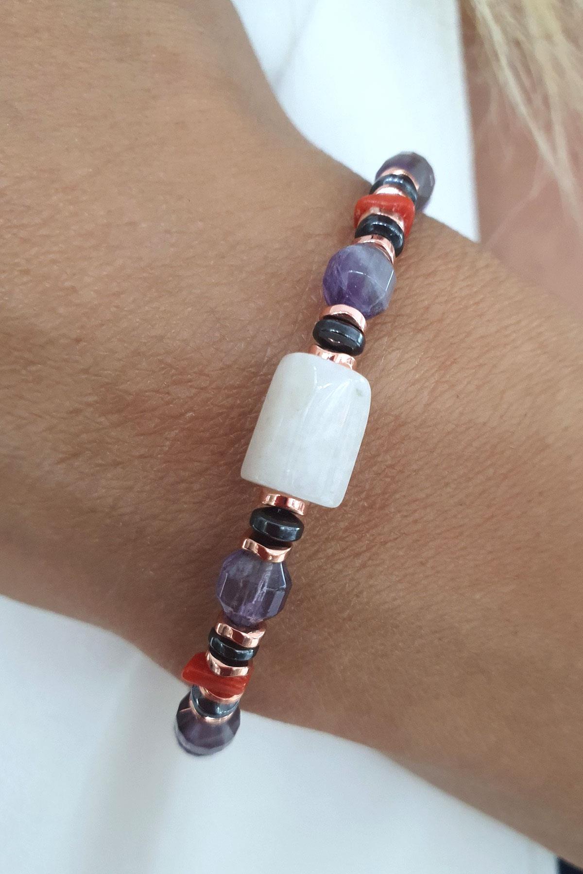 Doğal Ay taşı Ametist Hematit ve Mercan Taşlı 925 ayar Gümüş Ara parçalı Trend Bileklik