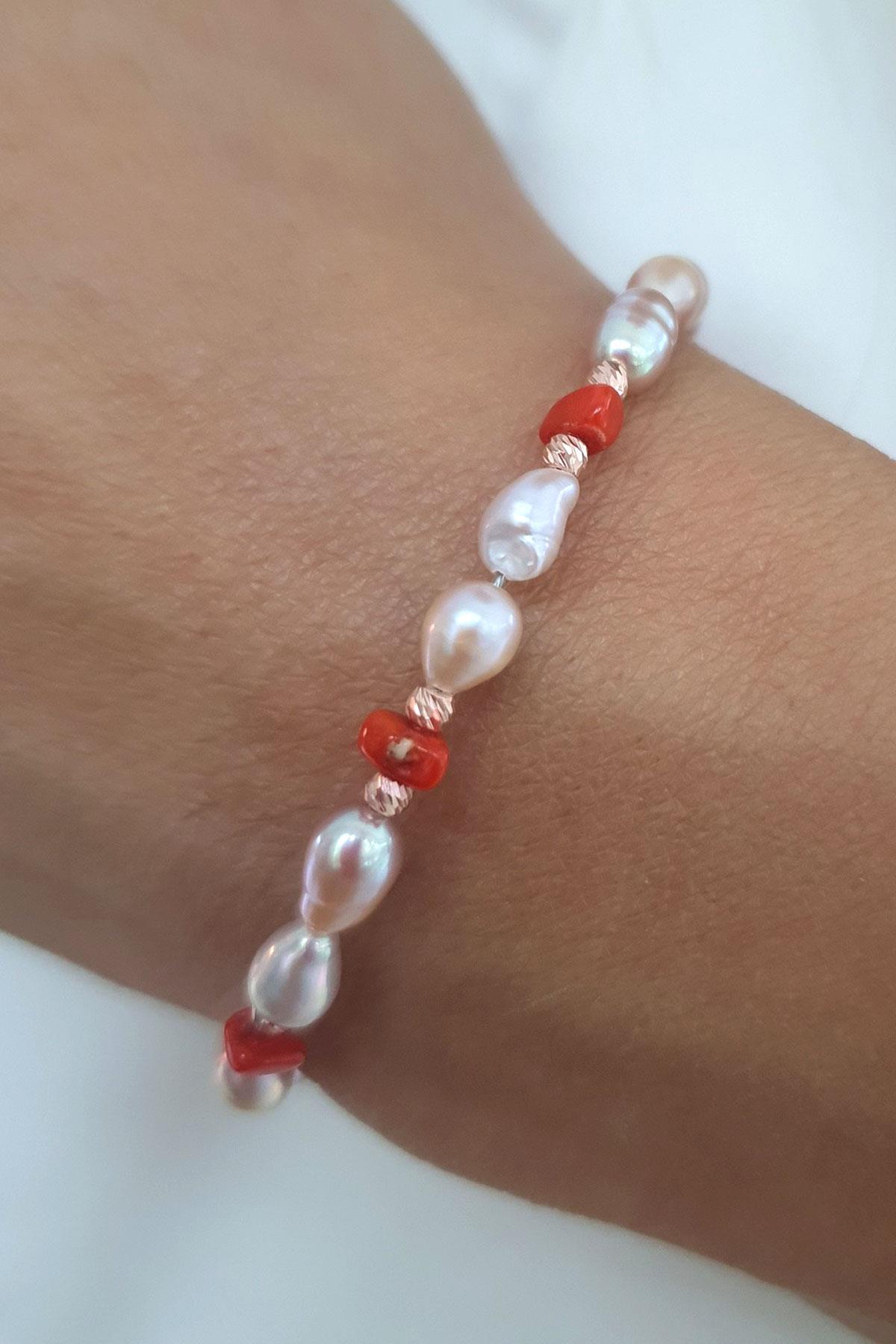 Doğal İnci Mercan Taşlı 925 ayar Gümüş Ara parçalı Tasarım Bileklik
