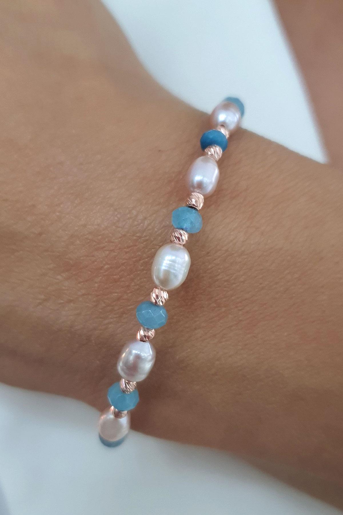 Doğal İnci ve Aquamarin Taşlı 925 ayar Gümüş Ara parçalı Tasarım Bileklik