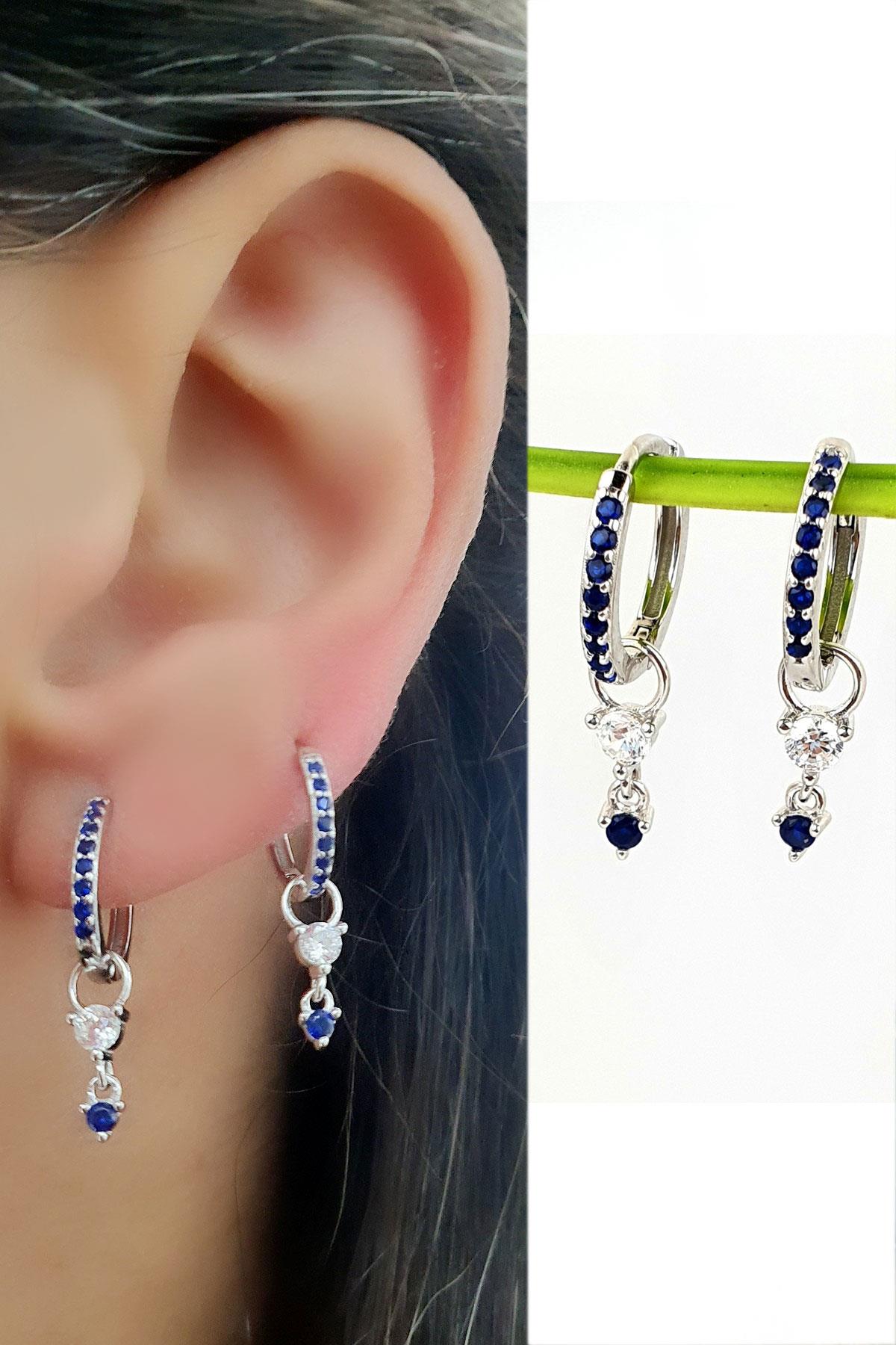LACİVERT Baget Zirkon Taşlı 925 ayar GÜMÜŞ Sallantılı Halka küpe sallantili uçları cıkartilabilir