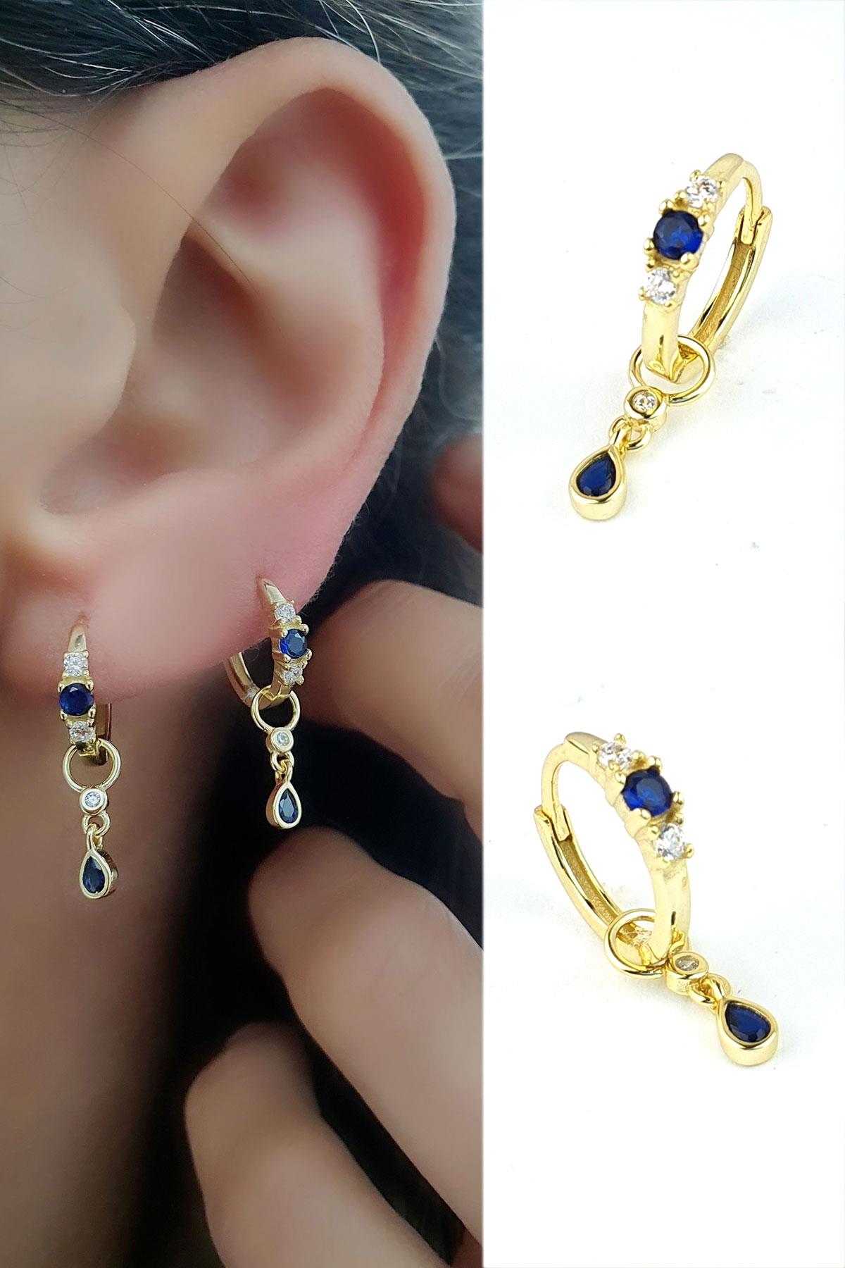 Lacivert Zirkon Taşlı 925 ayar Gümüş üzerine Altın kaplama Sallantılı Halka küpe sallantili uçları cıkartilabilir