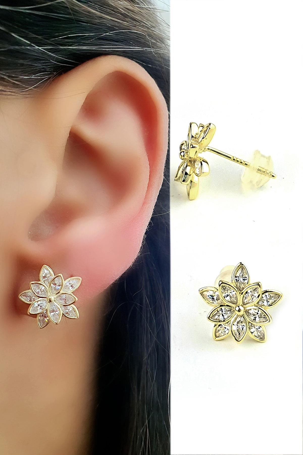 Pırlanta Parlaklığında Zirkon Taşlı 925ayar Gümüş Üzerine Altın Kaplama Tasarım Lotus Küpe