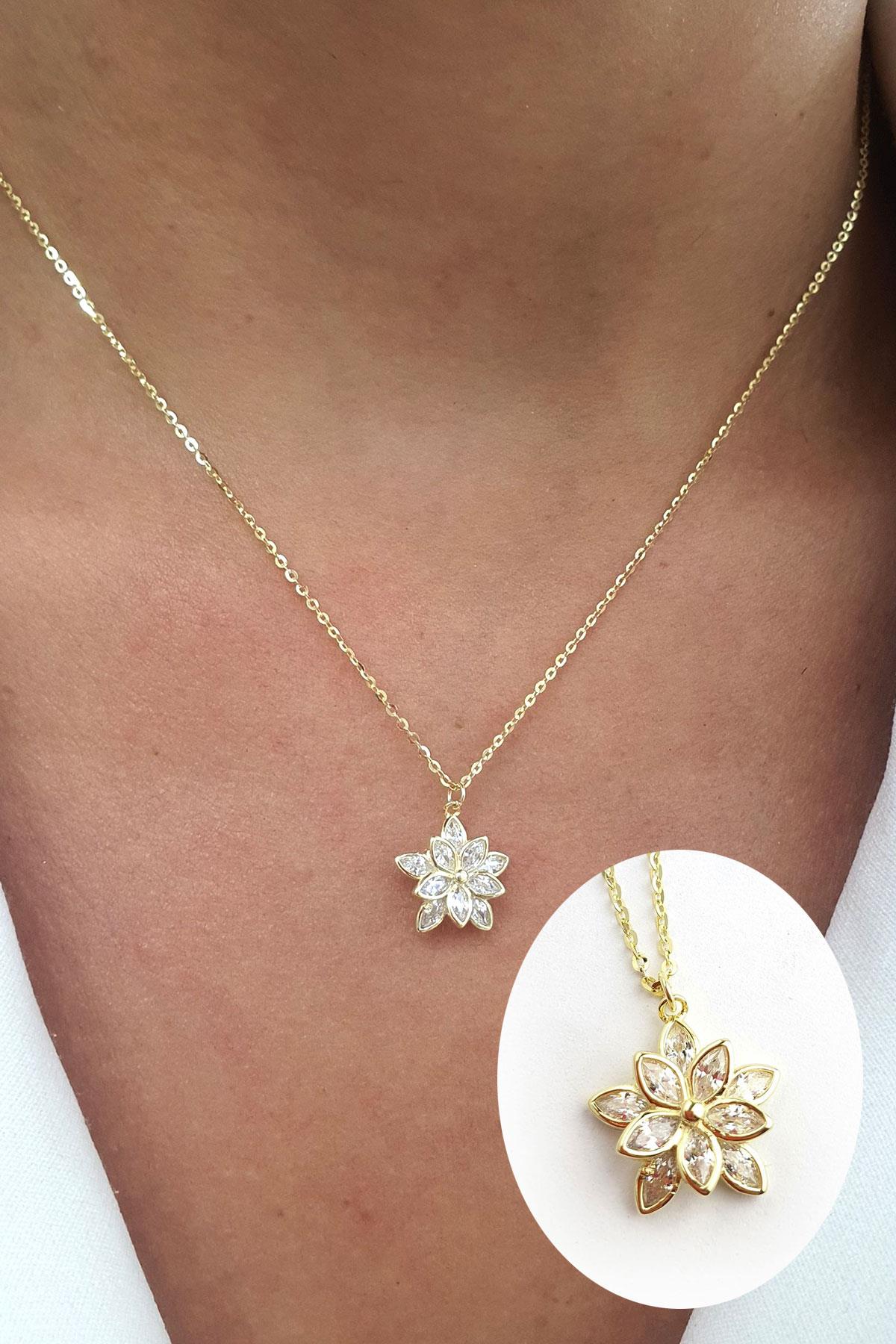 Zirkon Taş Detaylı 925 ayar Gümüş Üzerine Altın Kaplama Tasarım Lotus Çiçeği Kolye